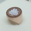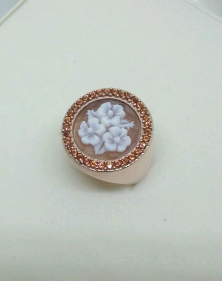 Anello in argento rosè e zirconi arancio con cammeo floreale inciso a mano.