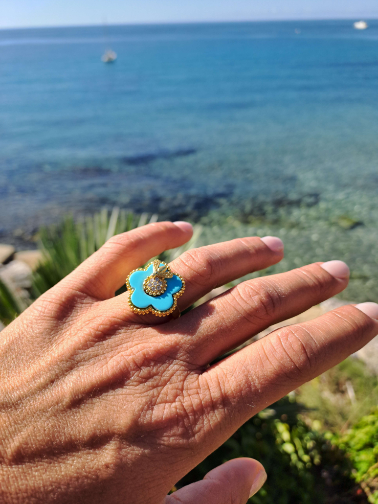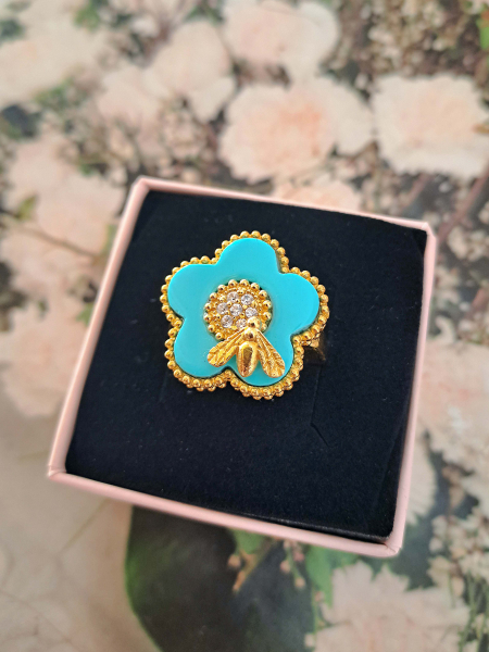 Fiore in pasta di turchese. Al centro del fiore un elemento con zirconi ed una deliziosa ape.