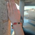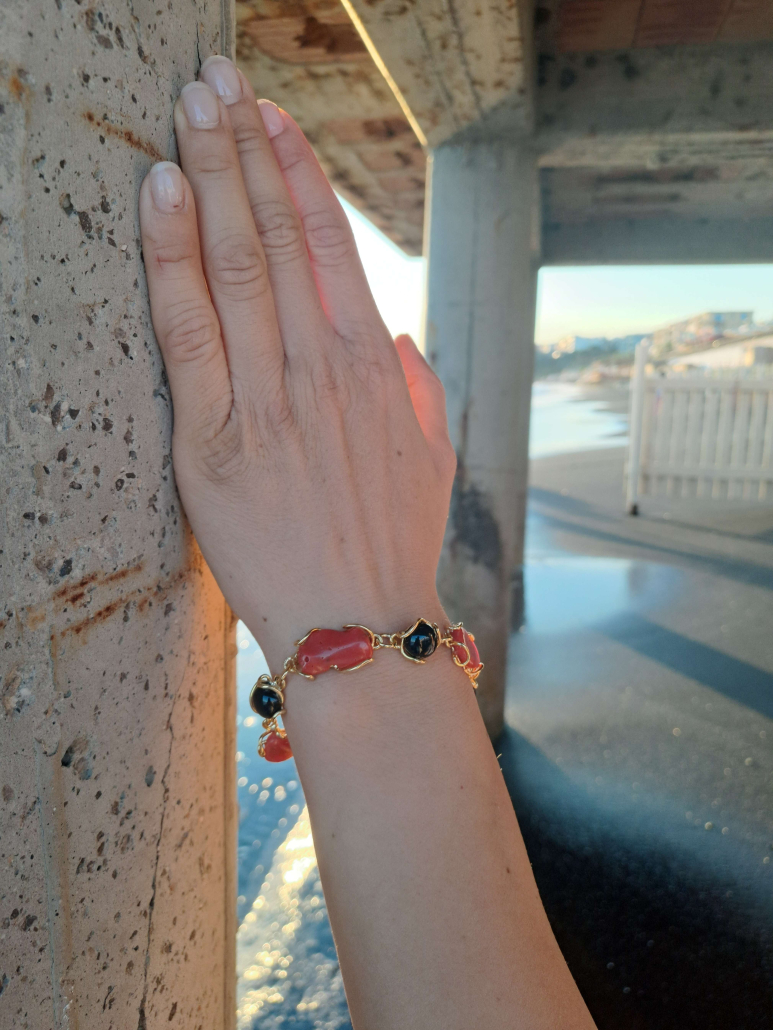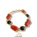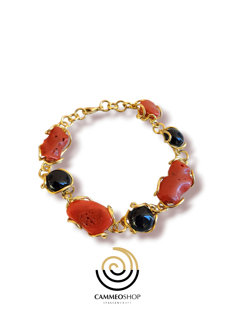 Montatura in argento 925 dorato, lavorazione artigianale in tutte le fasi. Lunghezza del bracciale corallo e agata nera: 18 centimetri con catena per allungo fino a 2 cm circa.