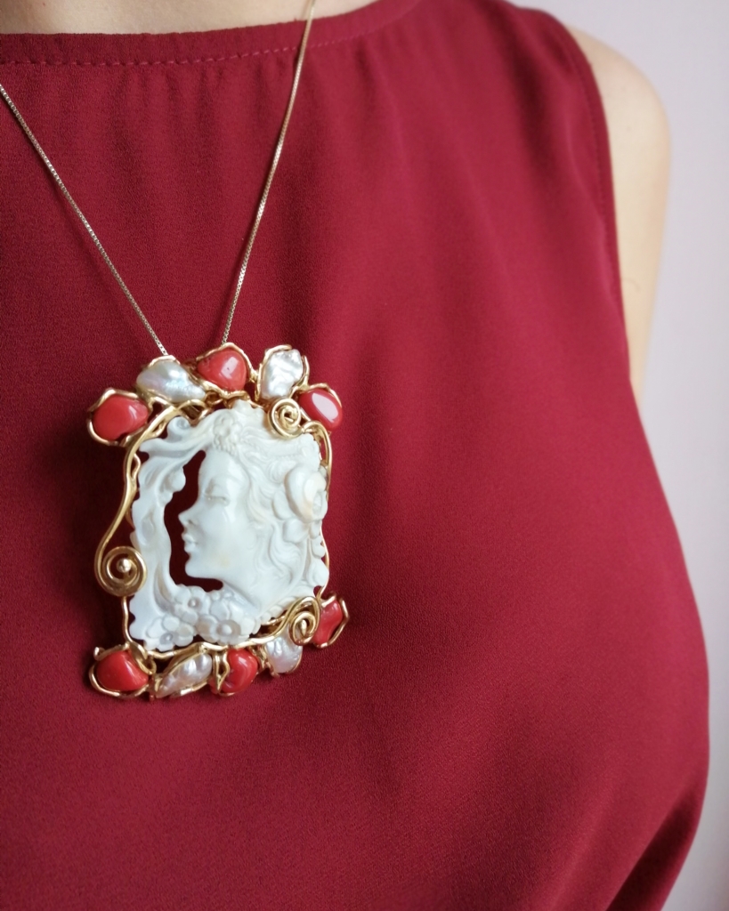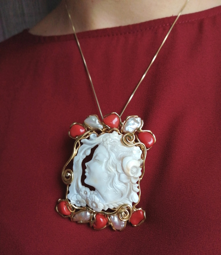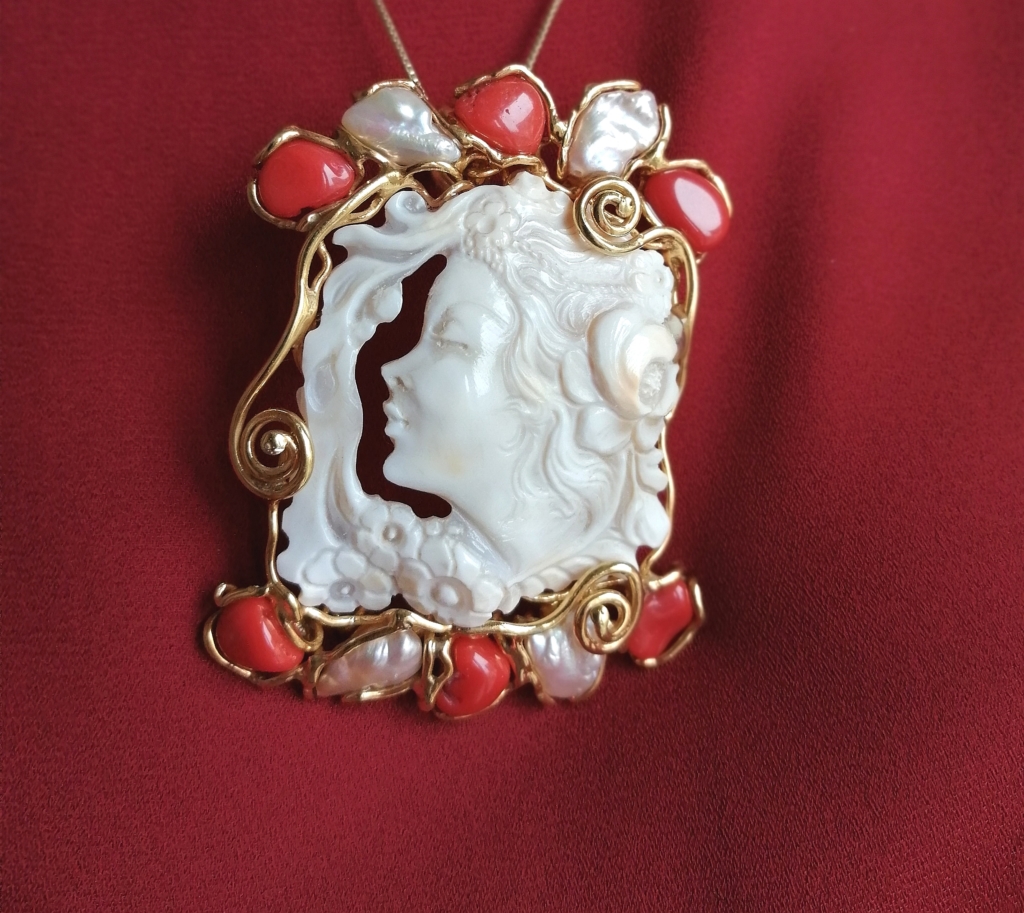 Particolare cammeo inciso a mano su conchiglia corneola e montato in argento 925 bagnato in oro giallo.