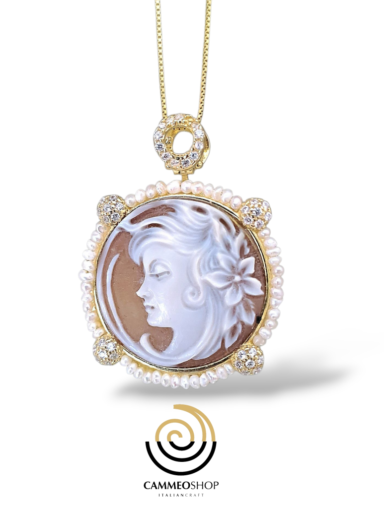 Il gancio con zirconi dona luminosità a questo ciondolo cammeo e perline. In omaggio una catenina in argento 925 dorato.