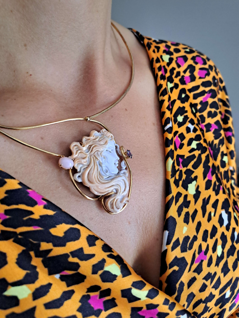 Questo collier rigido cammeo Lea è un accessorio molto particolare, ispirato alla bellezza dei cammei contemporanei con volto di donna e disegnato con l’intento di mettere insieme pietre semipreziose e cammei con raffinatezza e semplicità artigianale.