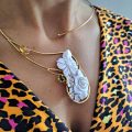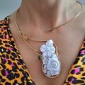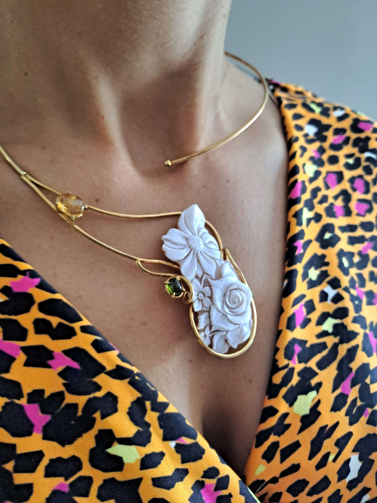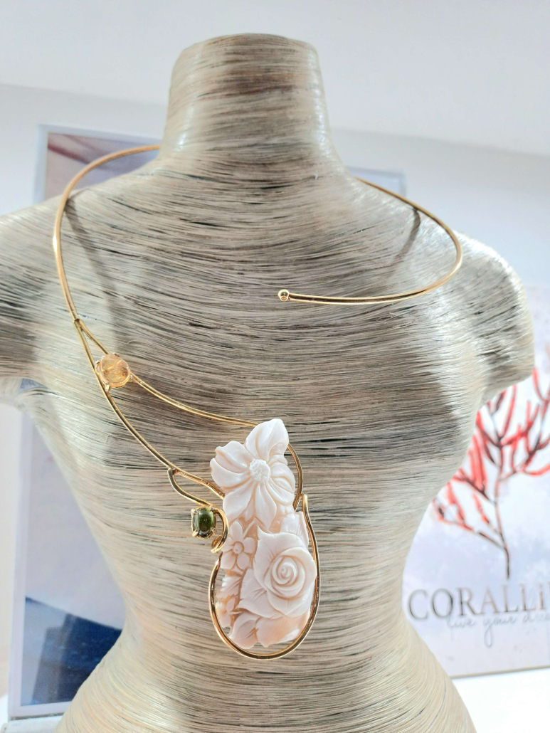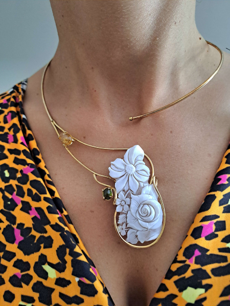 Questo collier rigido cammeo a fiori è un accessorio molto particolare, ispirato alla natura e disegnato con l’intento di mettere insieme pietre semipreziose e cammei con raffinatezza e semplicità artigianale.
