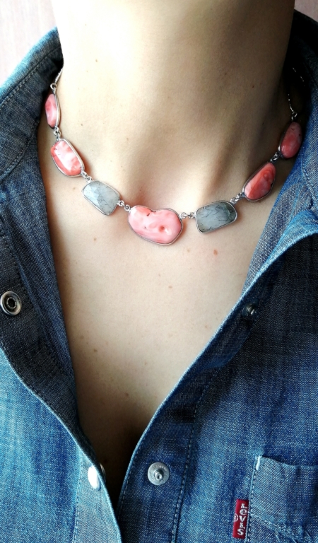 Perfetto abbinamento tra il calore del corallo rosa e l’eleganza luminosa del quarzo rutilato.