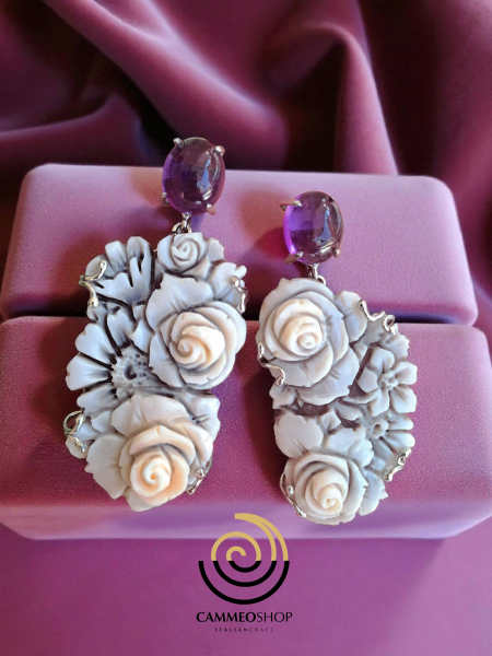 Cammei floreali realizzati completamente a mano su conchiglia sardonica. Manifattura di alta qualità made in Torre del Greco. Il design floreale di questi cammei originali è molto plastico e dettagliato per creare una vera tridimensionalità del motivo floreale.