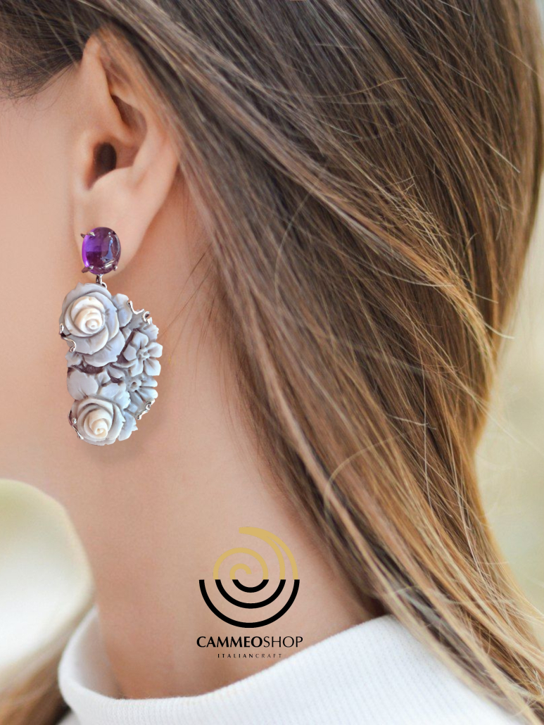 Orecchini montati in argento 925 rodiato, montatura semplice e leggera che lascia protagonisti pietre e cammei floreali.