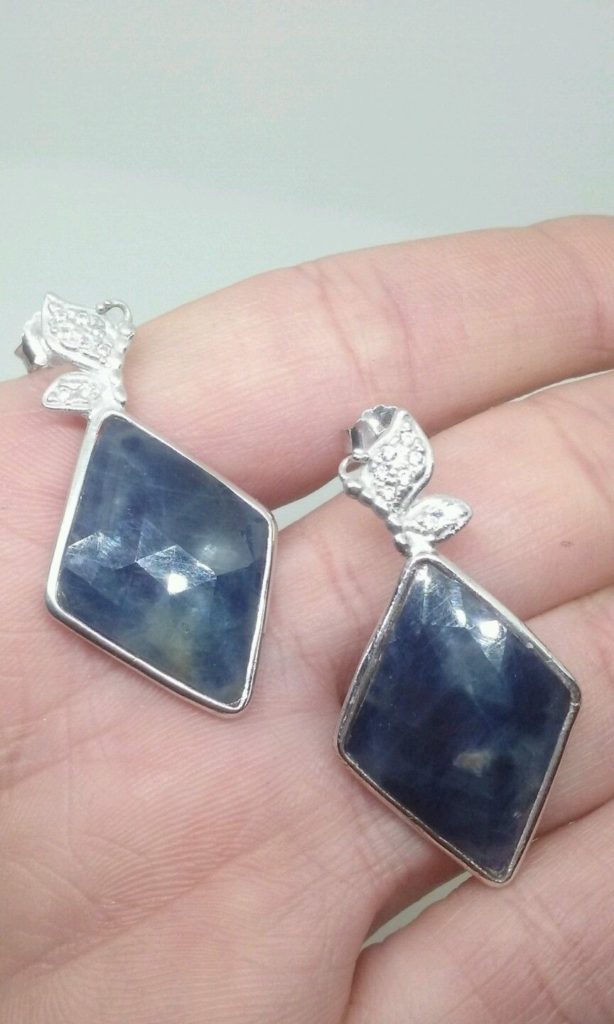 Orecchini in argento 925 rodiato con zirconi bianchi e zaffiri naturali. Lavorazione eseguita a mano in tutte le fasi. Le piccole farfalle in argento sono impreziosite da zirconi bianchi.