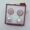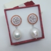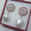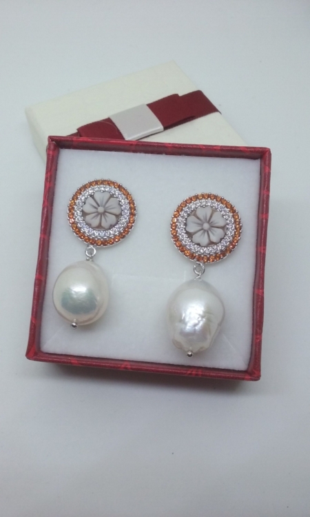 Orecchini in argento 925 rodiato con zirconi arancio e bianchi e cammei incisi a mano su conchiglia sardonica.Impreziositi da perle naturali barocche e molto luminose.