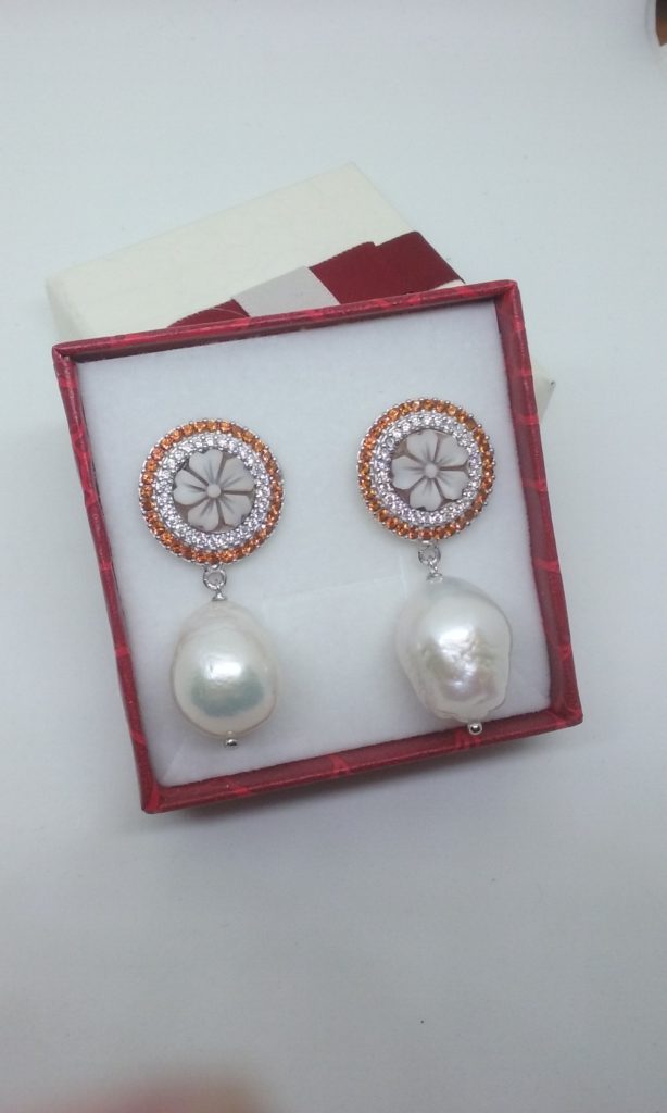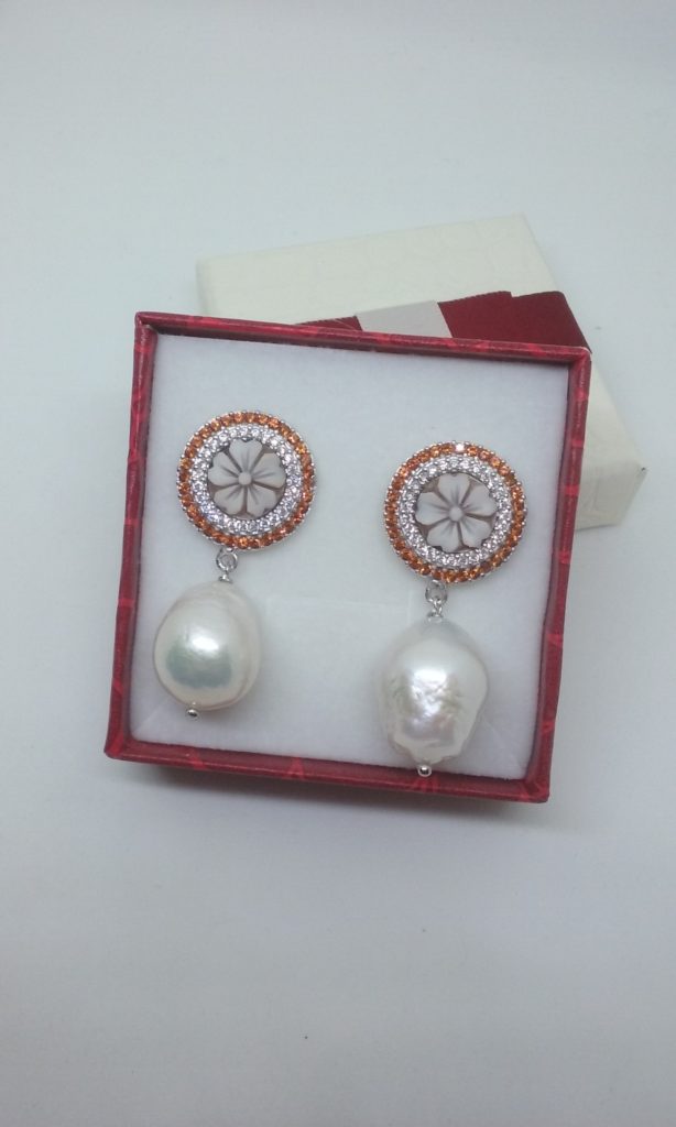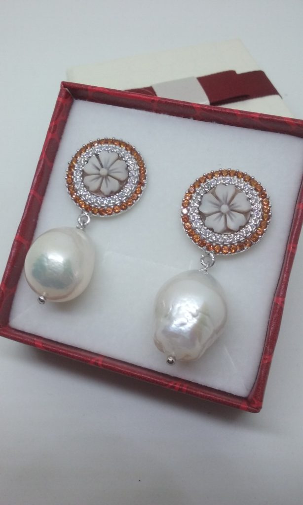 Orecchini in argento 925 rodiato con zirconi arancio e bianchi e cammei incisi a mano su conchiglia sardonica.Impreziositi da perle naturali barocche e molto luminose.