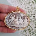 Cammeo ovale inciso a mano su conchiglia sardonica. Manifattura originale di Torre del Greco, elaborata e ricca di dettagli. Incisone realizzata negli anni Novanta. Dimensioni del cammeo: 7 centimetri.