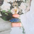 Montatura del pendente labradorite blu e corallo rosa realizzata in argento 925 dorato.