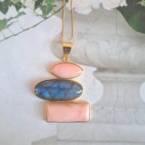 Pendente Labradorite blu e corallo rosa.